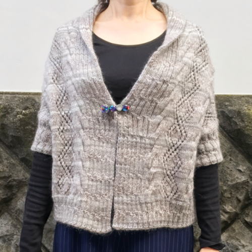 メイクメイクで編むカーディガンのニットキット(編みものキット) 編み針、無料編み図付きです まっすぐ編んで立体的にはいだボレロ風のカーディガン 要所要所の模様編みと変わったデザインが一目を惹くデザインです ■カラー:22番・グレー系の段染め(掲載作品) ■使用毛糸:オリムパス・メイクメイク(ウール90%モヘア10%) 15玉 ■使用針:2本棒針8号、4本棒針7号、なわ編み針u ■キット内容:着分毛糸、テキスト、2本棒針8号、4本棒針7号 ■サイズ:フリーサイズ(個人の編み具合によりサイズが異なる場合もございます) ■出来上がりサイズ:胸囲フリー、着丈約58cm、裄丈約39cm ★